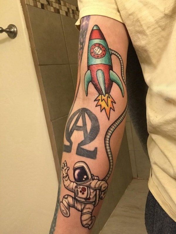 手臂纹身素材 男生手臂上火箭和宇航员纹身图片