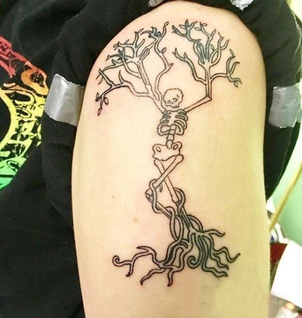 双大臂纹身 男生大臂上树状的骷髅纹身图片