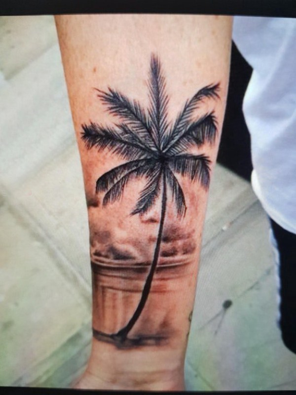 手臂纹身素材 男生手臂上彩色的椰树纹身图片