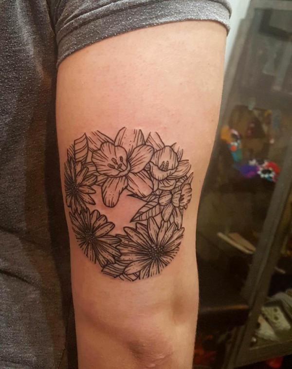 大臂纹身图 男生大臂上黑色的植物花朵纹身图片