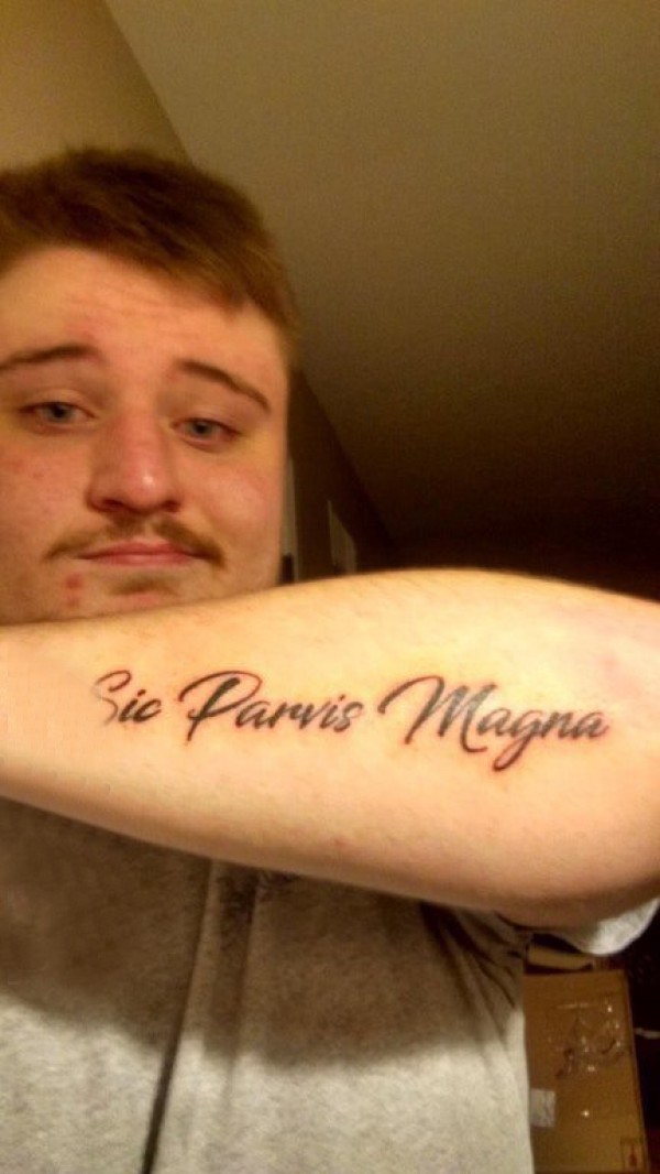 花体英文纹身 男生手臂上黑色的花体英文纹身图片