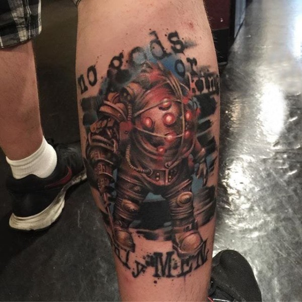 大腿纹身男 男生大腿上彩色的机器人纹身图片