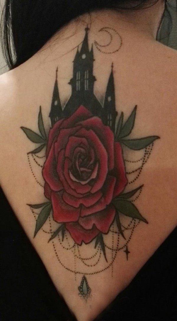 纹身后背女 女生后背上建筑物和花朵纹身图片