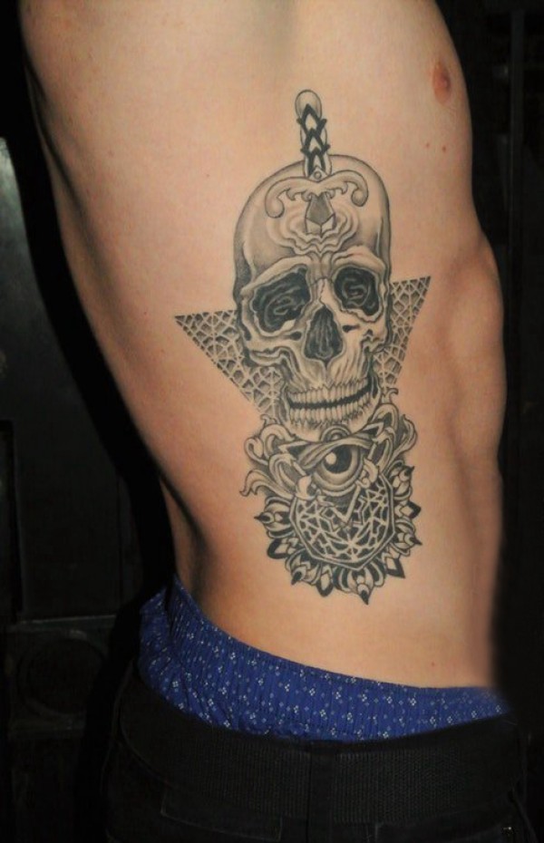 侧腰纹身男 男生侧腰上梵花和骷髅纹身图片