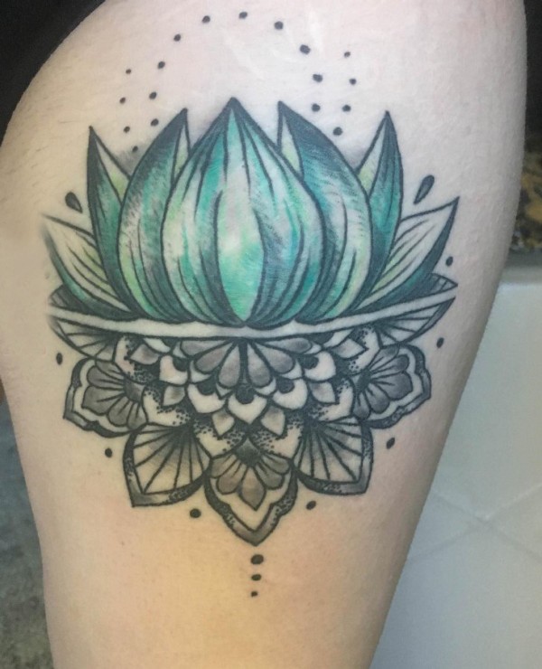 大腿纹身传统 女生大腿上彩色的莲花纹身图片