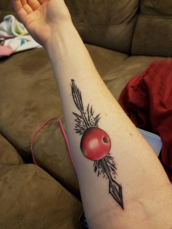 手臂纹身素材 男生手臂上苹果和箭矢纹身图片