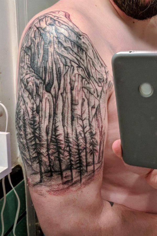 双大臂纹身 男生大臂上大树和山脉纹身图片