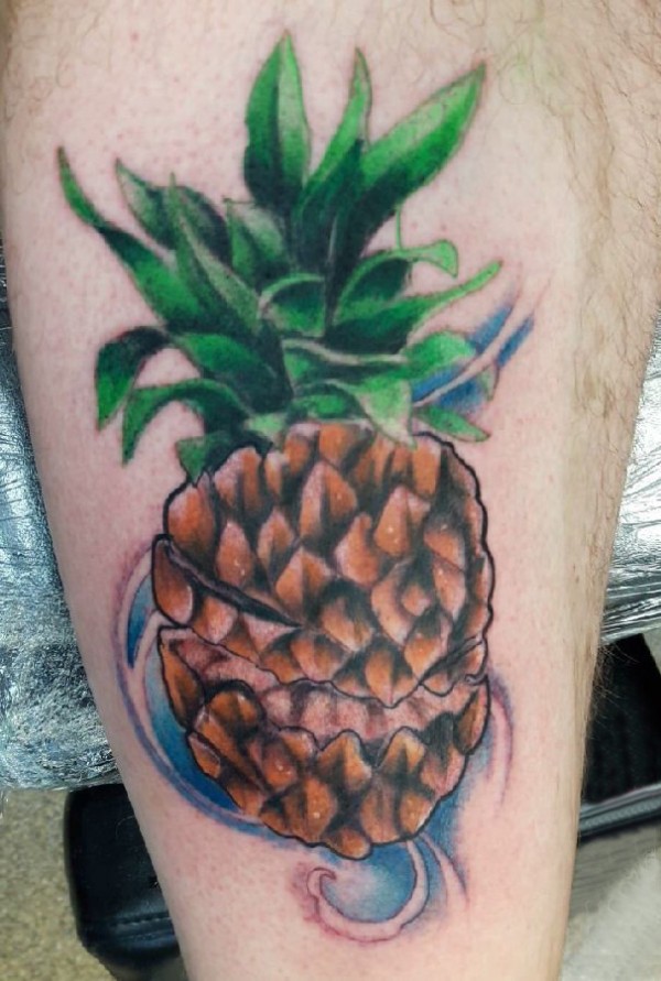 纹身大腿男 男生大腿上彩色的菠萝纹身图片