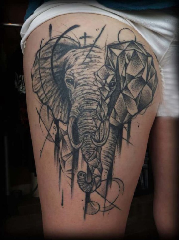 大腿纹身传统 女生大腿上黑色的大象纹身图片