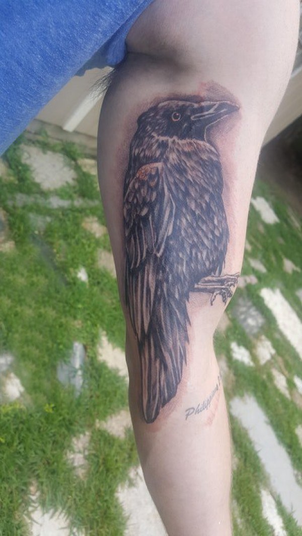 手臂纹身素材 男生手臂上黑色的乌鸦纹身图片
