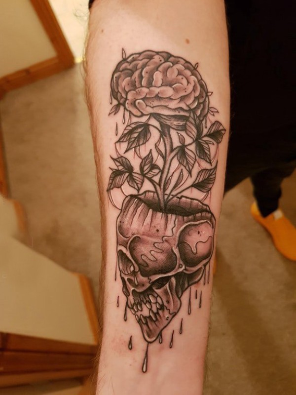 骷髅纹身 男生手臂上大脑和骷髅纹身图片