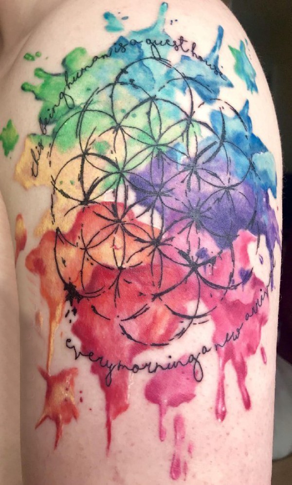 大臂纹身图 男生大臂上彩色的圆形纹身图片