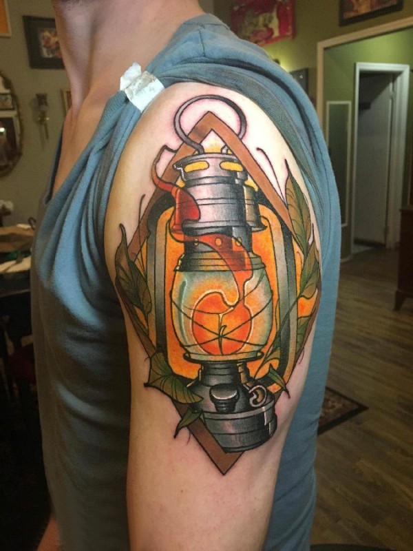 大臂纹身图 男生大臂上彩色的煤油灯纹身图片
