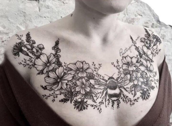 纹身锁骨女 女生锁骨上蜜蜂和花朵纹身图片