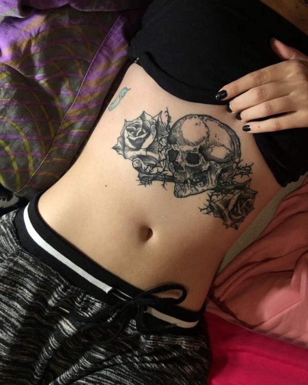 腹部纹身 女生腹部玫瑰和骷髅纹身图片