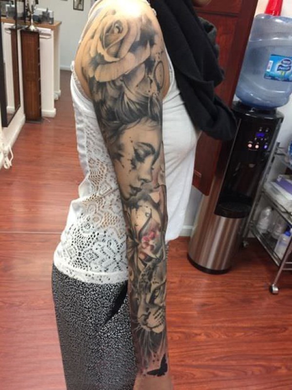 纹身手臂女生 女生手臂上黑灰的人物纹身图片