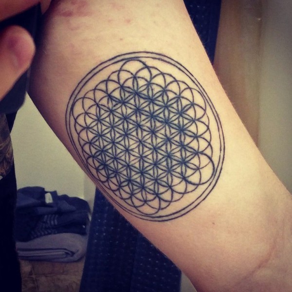 几何元素纹身 男生大臂上黑色的几何圆形纹身图片