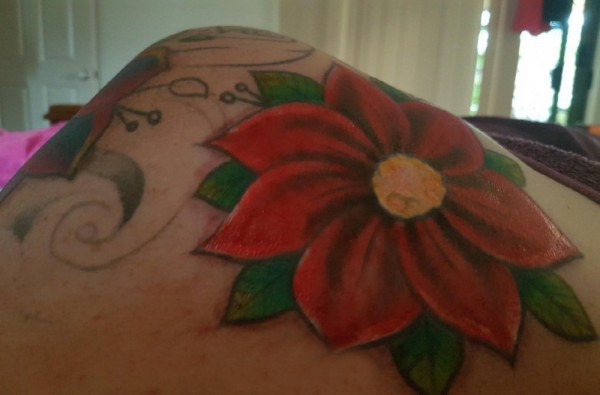 后肩纹身 男生后肩上彩色的花朵纹身图片