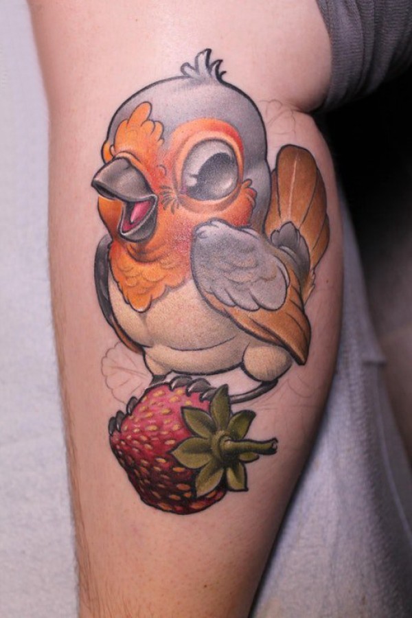 欧美小腿纹身 女生小腿上草莓和小鸟纹身图片