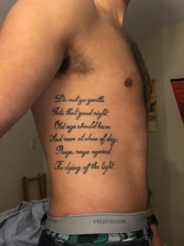 花体英文纹身 男生侧肋上花体英文纹身图片