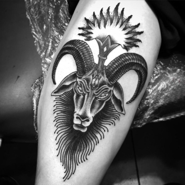 欧美小腿纹身 男生小腿上黑色的山羊纹身图片