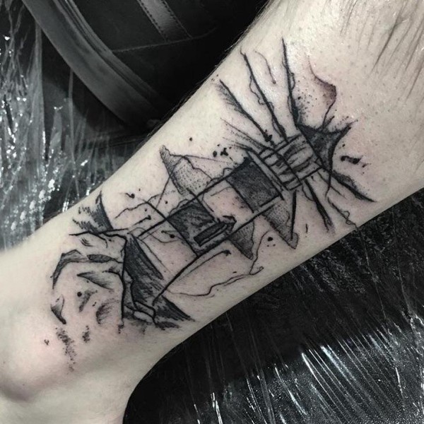 欧美小腿纹身 男生小腿上黑色的灯塔纹身图片