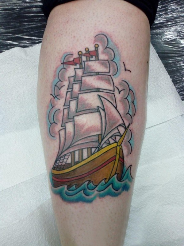 欧美小腿纹身 男生小腿上航行的帆船纹身图片