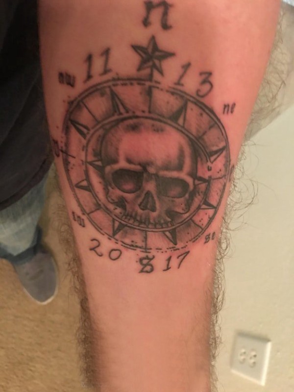 手臂纹身素材 男生手臂上指南针和骷髅纹身图片