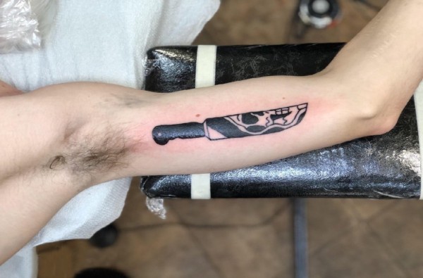 双大臂纹身 男生大臂上黑色的骷髅匕首纹身图片