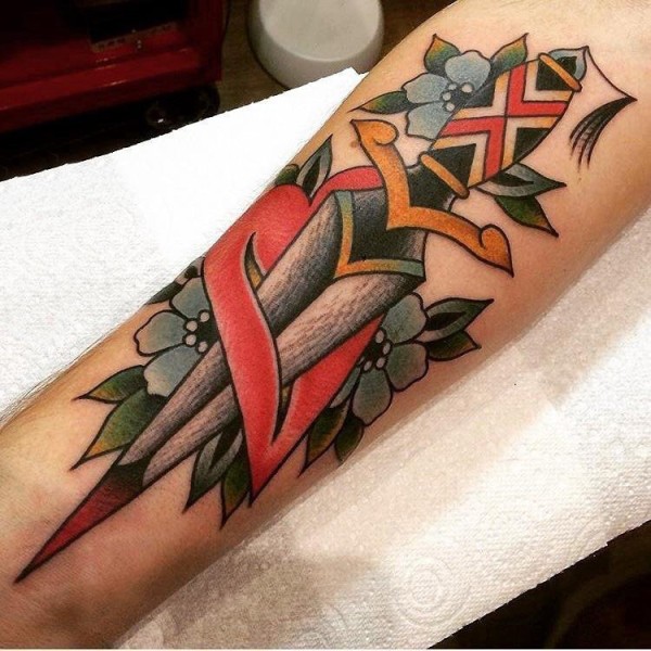 手臂纹身素材 男生手臂上心形和匕首纹身图片