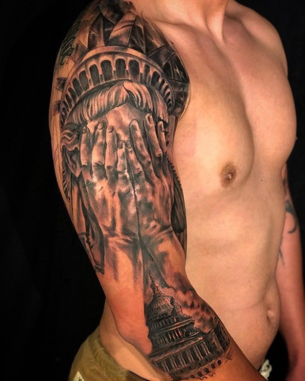 手臂纹身素材 男生手臂上建筑物和人物纹身图片