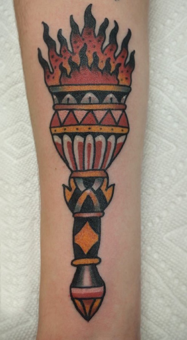 手臂纹身素材 女生手臂上彩色的火炬纹身图片