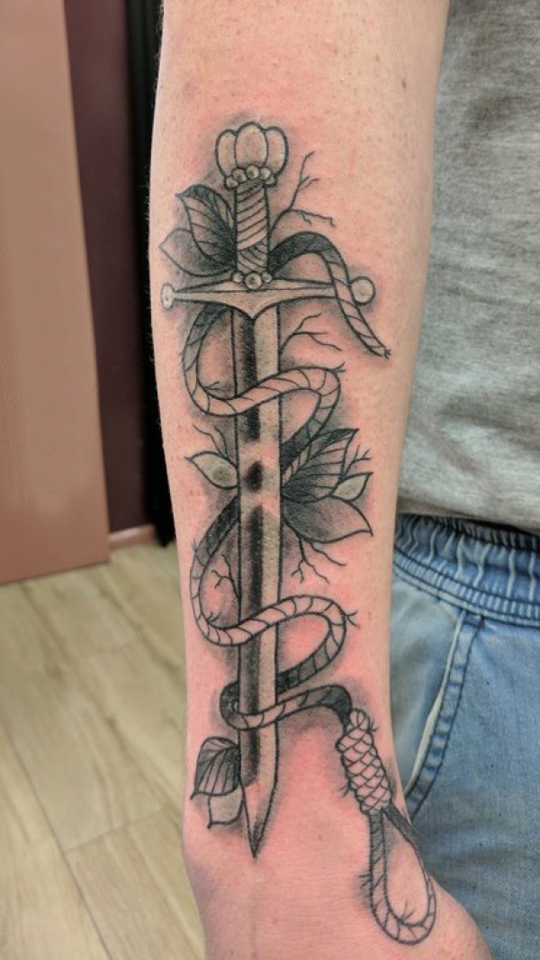 手臂纹身素材 男生手臂上植物和剑纹身图片