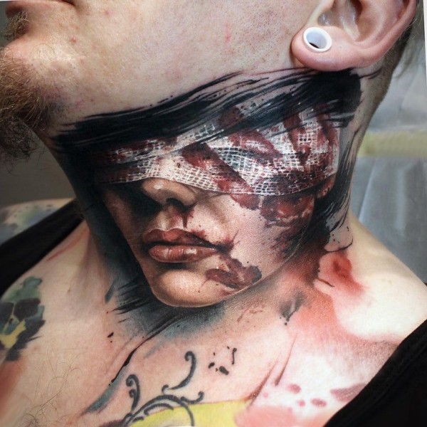颈部纹身设计 男生颈部彩色的人物纹身图片