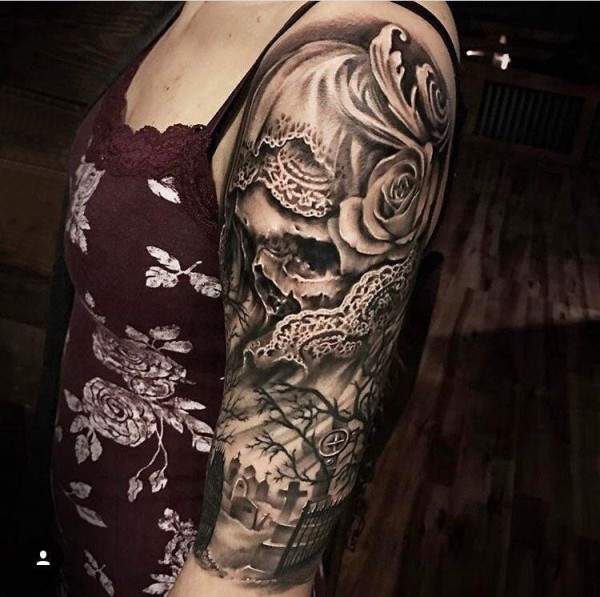 双大臂纹身 女生大臂上花朵和骷髅纹身图片