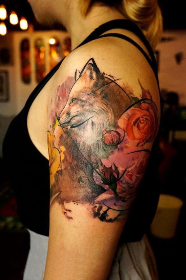 双大臂纹身 女生大臂上花朵和狐狸纹身图片