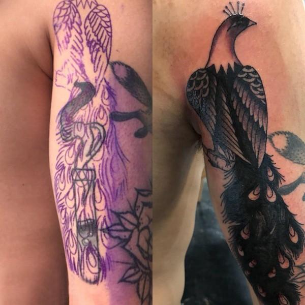 纹身覆盖 男生手臂上黑色的孔雀纹身图片