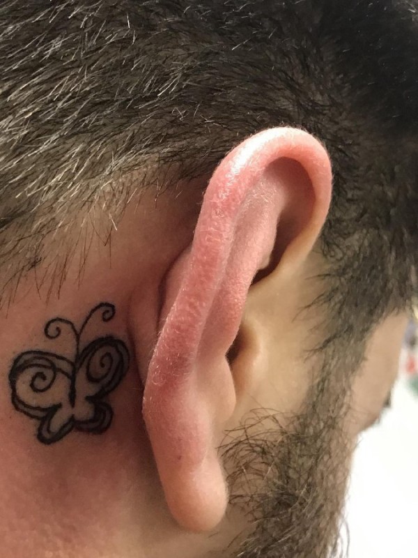 纹身耳后男 男生耳后黑色的蝴蝶纹身图片