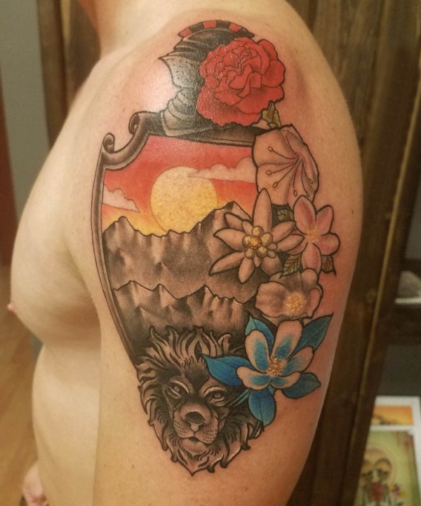 大臂纹身图 男生大臂上花朵和风景纹身图片