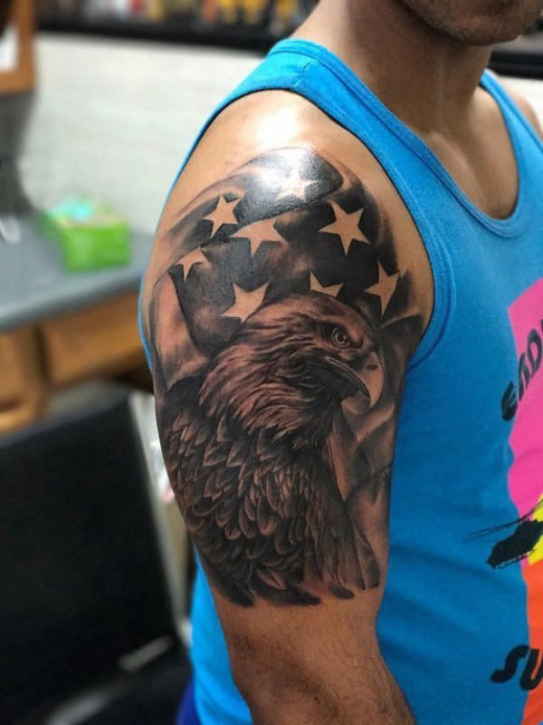 大臂纹身图 男生大臂上国旗和老鹰纹身图片