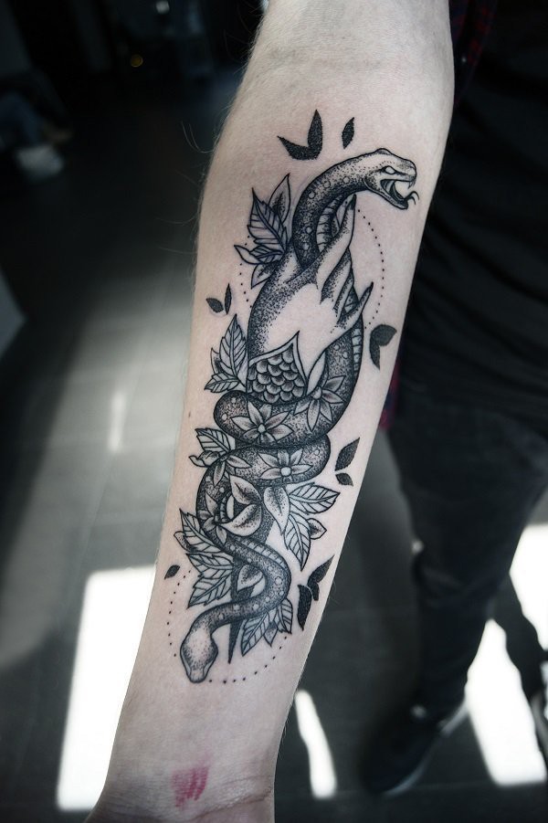 黑色和白色手臂眼镜蛇纹身动物几何点刺纹身图案