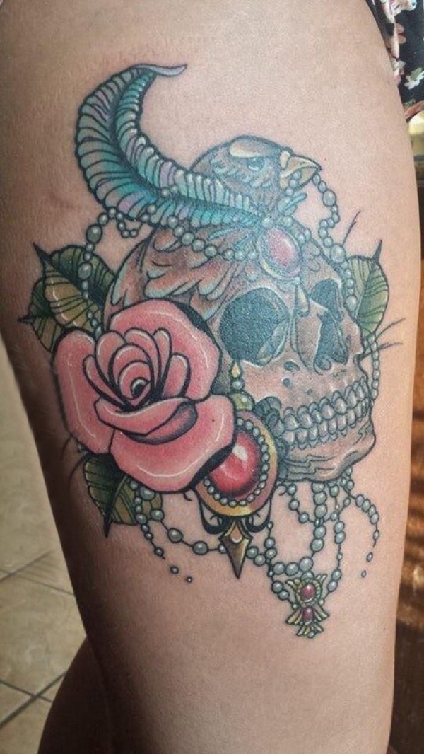 纹身骷髅头 女生大腿上骷髅头纹身图片