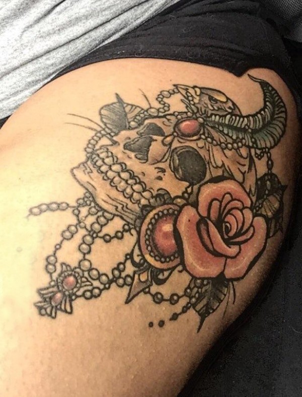 纹身骷髅头 女生大腿上骷髅头纹身图片