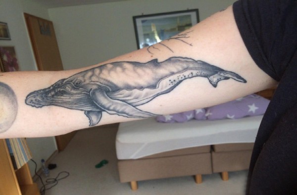 百乐动物纹身 男生大臂上黑色的鲸鱼纹身图片
