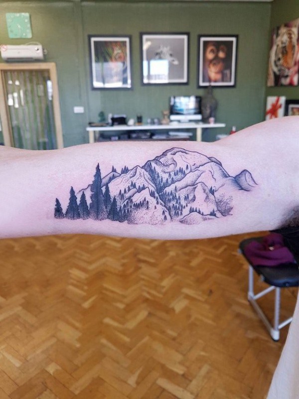 双大臂纹身 男生大臂上树和山脉纹身图片