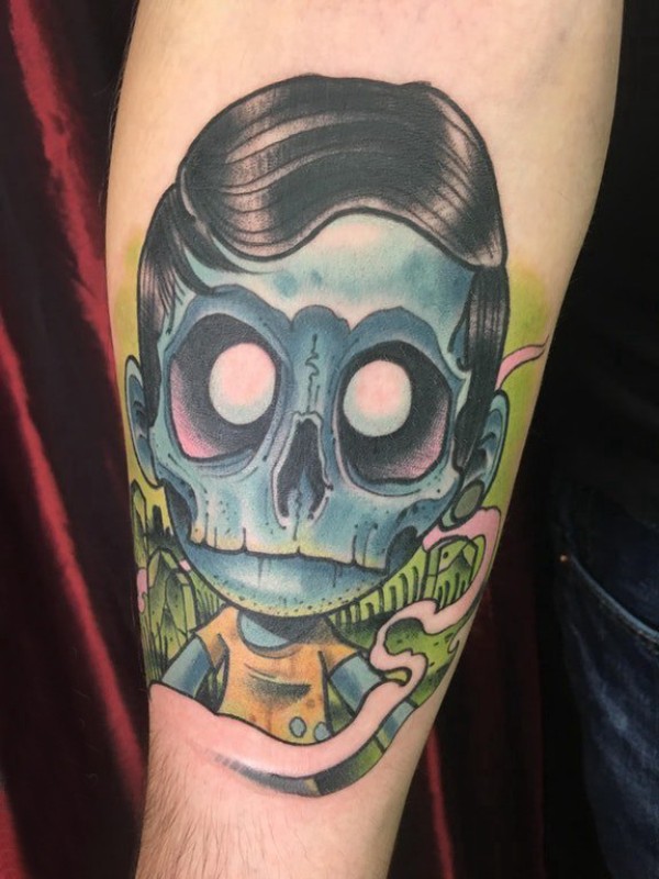 手臂纹身素材 男生手臂上彩色的卡通僵尸纹身图片