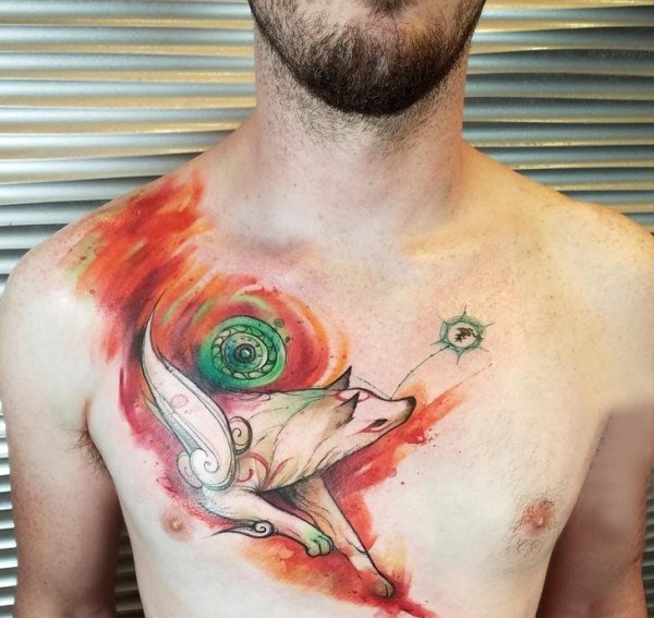 九尾狐狸纹身 男生胸部彩色的狐狸纹身图片