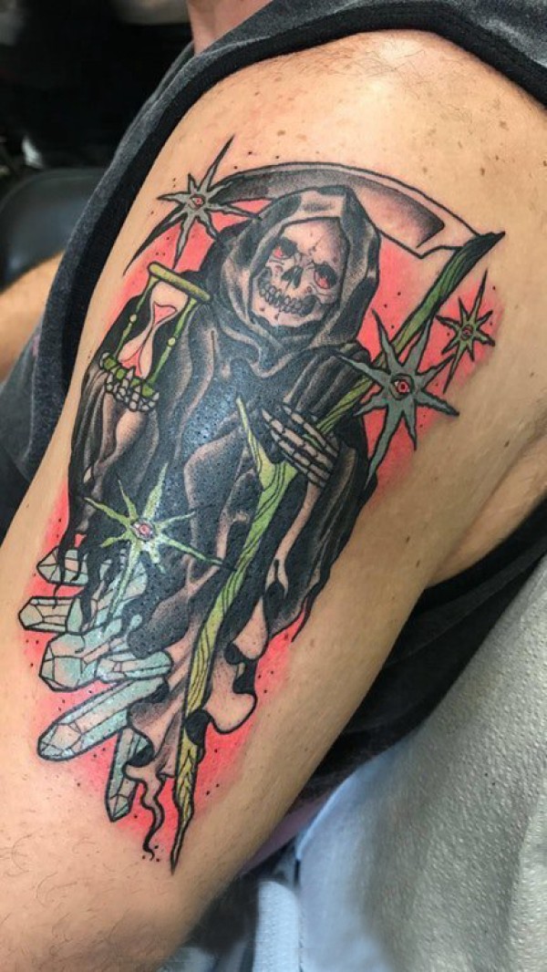 大臂纹身图 男生大臂上彩色的死神镰刀纹身图片