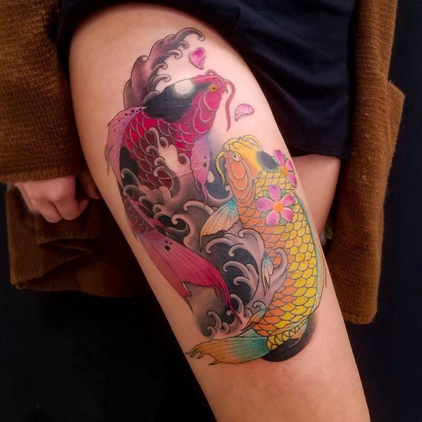 大腿传统纹身 女生大腿上彩色的鲤鱼纹身图片