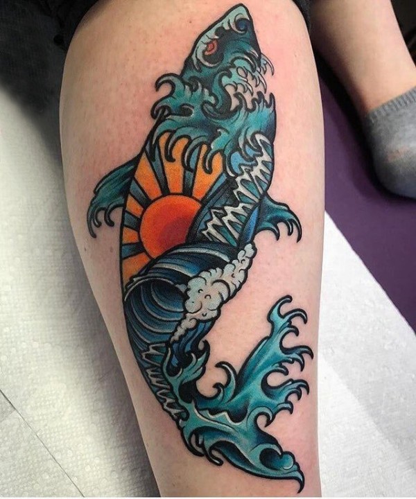 欧美小腿纹身 女生小腿上风景和鲨鱼纹身图片